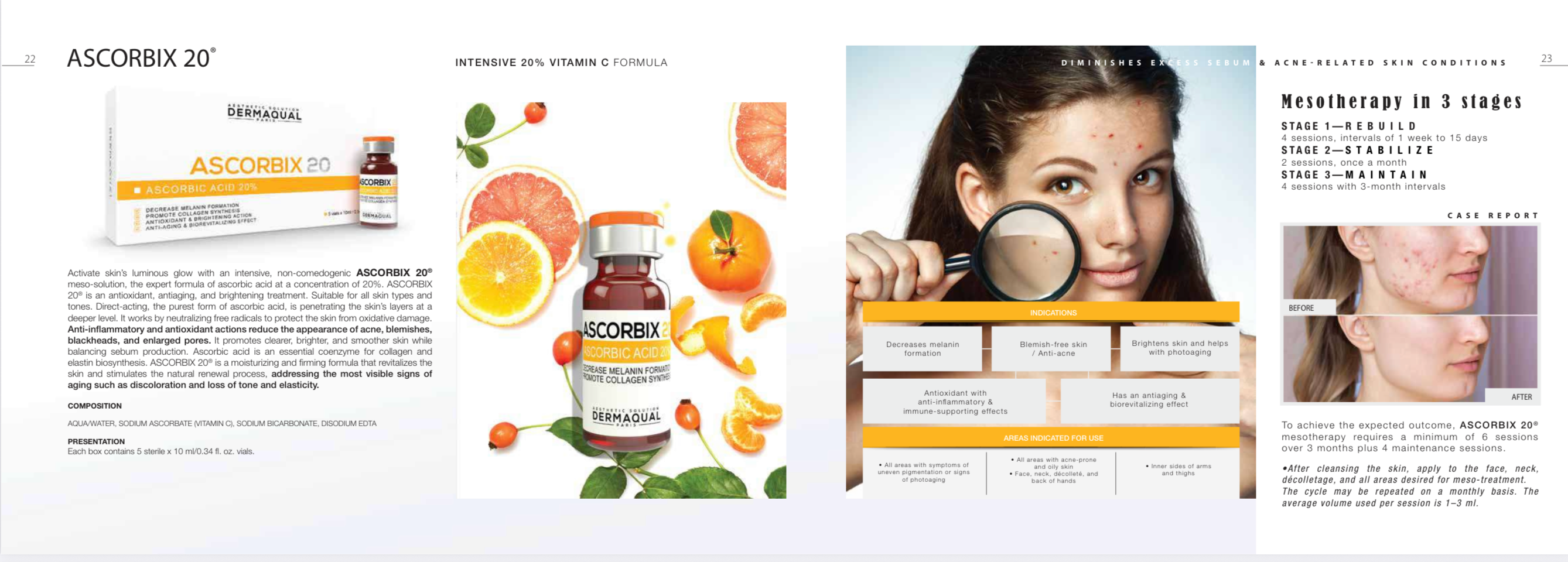 ASCORBIX 20 is a powerful brightening Vitamin C solution at a concentration of 20% Vitamin C (L-Ascorbic Acid), clinically proven to target the most visible signs of aging, the appearance of lines, and wrinkles, discoloration, loss of tone, and elasticity. The antioxidant properties of L-Ascorbic Acid and its role in collagen synthesis make Vitamin C a vital molecule for skin health. The potent form of L-Ascorbic Acid works by neutralizing free radicals to protect the skin from oxidative damage such as sun damage and environmental pollution. Anti-inflammatory action reduces the appearance of acne, blemishes, and blackheads. As a result, it promotes clearer, brighter, and smoother skin while balancing sebum production. ASCORBIX 20 helps restore the skin’s firmness, instantly delivers luminosity, and creates a revitalized, radiant complexion.