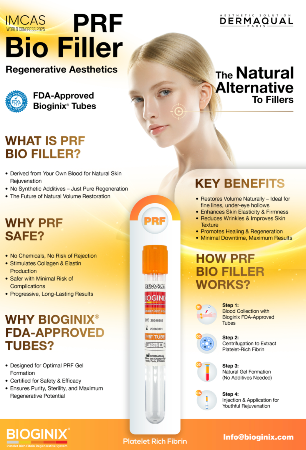BIOGINIX by Dermaqual offers specialized, FDA-certified tubes designed for advanced regenerative treatments: Platelet-Rich Fibrin (PRF). Cutting-edge technology for safe, effective, and easy blood separation, enhancing natural rejuvenation, healing, and tissue regeneration in medical aesthetics.