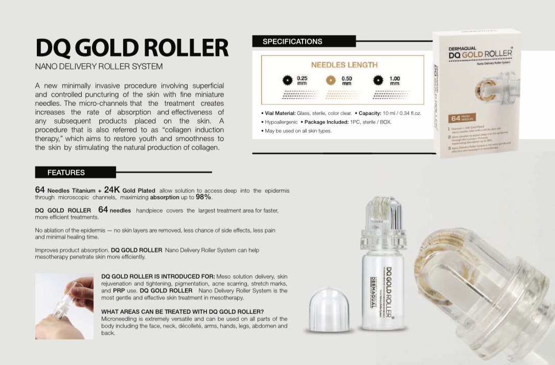 DQ GOLD ROLLER Nano Delivery Roller System by DERMAQUAL is a new minimally invasive procedure involving superficial and controlled skin puncturing with fine miniature needles. 64 Needles Titanium + 24k gold Plated causes micro penetration, creating infusion channels in the skin allowing solution to access deep into the epidermis maximising absorption up to 98%. Introduced for skin rejuvenation, tightening, pigmentation, acne, post traumatic / burns scaring, alopecia, PRP use, meso-solution delivery, hyperhidrosis and stretch marks, skin improvements are significantly enhanced by combining DQ GOLD ROLLER with DERMAQUAL mesotherapy cocktails according to the client’s skin type or concern.