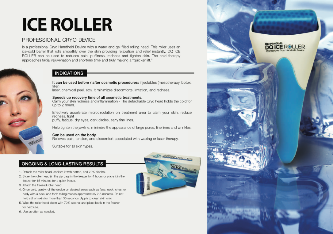 It is a professional Cryo Handheld Device with water and a gel-filled rolling head. This roller uses an ice-cold barrel that rolls smoothly over the skin, providing instant relaxation and relief. DQ ICE ROLLER can reduce redness and puffiness and tighten the skin. Cold therapy approaches facial rejuvenation, shortens the treatment time, and truly makes a “quicker lift.”