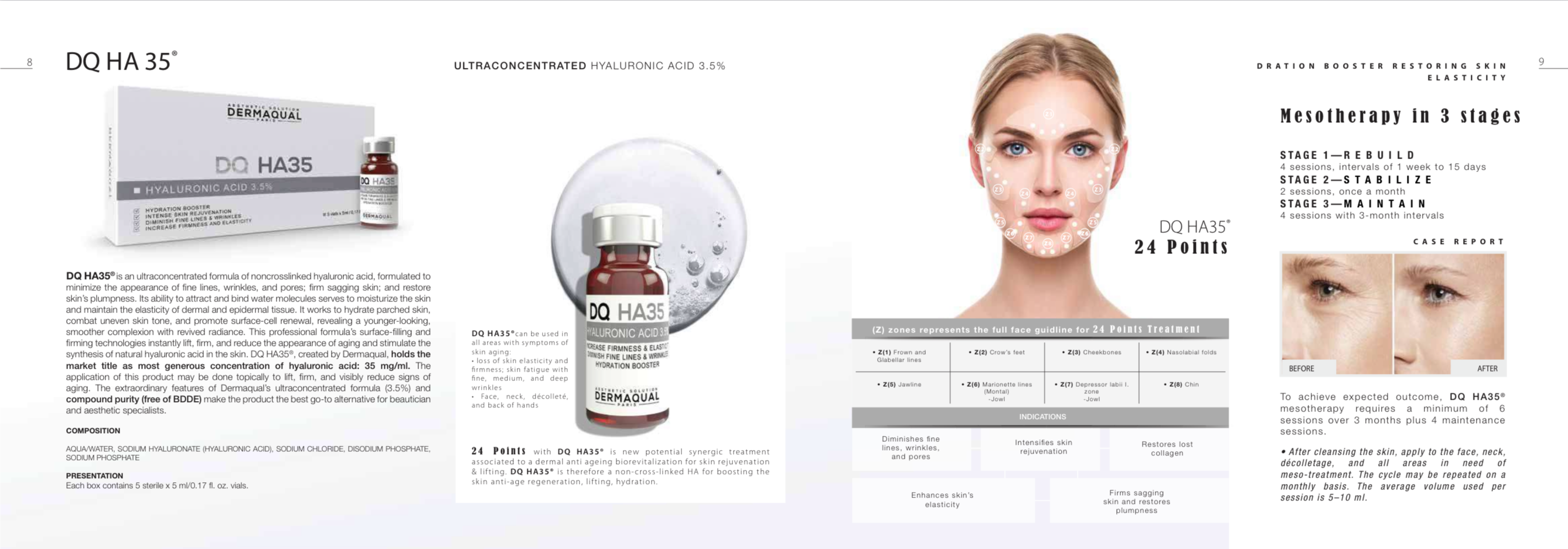 DQ HA35 is an ultraconcentrated formula of non-crosslinked hyaluronic acid, formulated to minimize the appearance of fine lines, wrinkles, and pores, firm sagging skin, and restore skin plumpness. Its ability to attract and bind water molecules serves to moisturize the skin and maintain the elasticity of dermal and epidermal tissue. It works to hydrate parched skin, combat uneven skin tone, and promote surface-cell renewal, revealing a younger-looking, smoother complexion with revived radiance. This professional formula’s surface-filling and firming technologies instantly lift, firm, and reduce the appearance of aging and stimulate the synthesis of natural hyaluronic acid in the skin. DQ HA35, created by Dermaqual, holds the market title as the most generous concentration of hyaluronic acid: 35 mg/ml. The application of this product may be done topically to lift, firm, and visibly reduce signs of aging. The extraordinary features of Dermaqual’s ultraconcentrated formula (3.5%) and compound purity (free of BDDE) make the product the best go-to alternative for beauticians and aesthetic specialists.