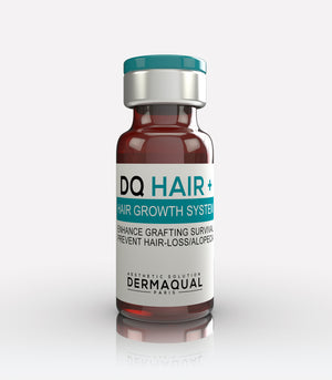 DQ HAIR+ is a hair-restorative solution. Each vial contains a powerful combination of vitamin B complex (panthenol + pyridoxine + thiamine + biotin) and mineral salts, essential for revitalizing, protecting, and promoting hair growth. DQ HAIR+ is specifically formulated to accelerate hair growth; it restores and increases local microcirculation in the scalp. DQ HAIR+ provides nutritional input and slows the programmed process of follicular involution (stops hair loss). By reactivating the capillary formation process, it also speeds the formation of new hair follicles and provides them necessary nutrients. Panthenol (vitamin B5) acts as a precursor to coenzyme A (CoA), necessary for acetylation reactions. CoA is the cofactor of one of the most important enzymes of the intermediate metabolism; it acts as a cleanser for the scalp and hair follicles by reducing excess secretions of the sebaceous glands. The Iron in gluconate salt plays an important role in the oxidative and hydrogen transport system of the hair follicle. Biotin (vitamin B7) stimulates the production of elastin, helps in the formation of fatty acids, and promotes healthy hair. DQ HAIR+ is a groundbreaking new treatment that helps reactivate dormant hair follicles, leaving hair lush, strong, healthy, and shiny.