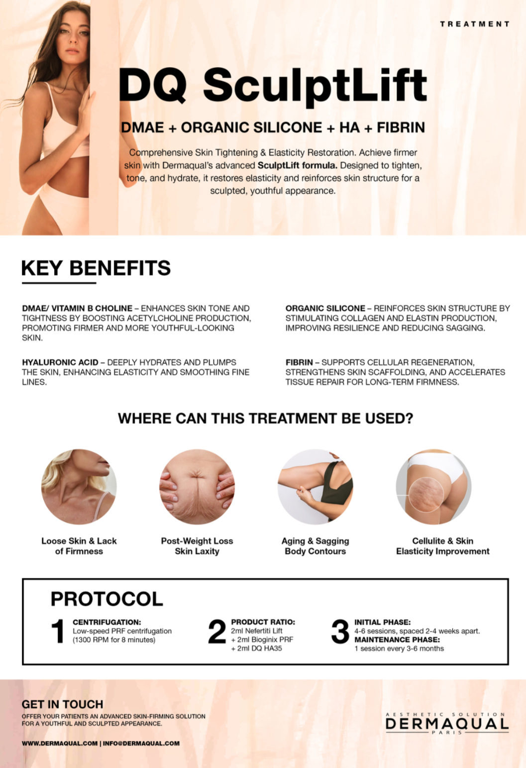 Fibrin, a key ingredient in DQ SculptLift, promotes cellular regeneration and strengthens skin scaffolding for long-term firmness. With its powerful tissue repair capabilities, you can expect dramatic and noticeable results.