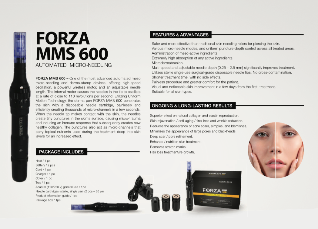 One of the most advanced automated meso micro-needling and derma-stamp devices, offering high-speed oscillation, a powerful wireless motor, and an adjustable needle length. The internal motor causes the needles in the tip to oscillate at a rate of close to 110 revolutions per second. Utilizing Uniform Motion Technology, the derma pen FORZA MMS 600 penetrates the skin with a disposable needle cartridge, painlessly and efficiently creating thousands of micro-channels in a few seconds.