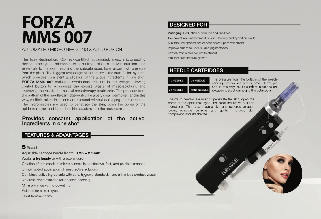 - Improves product absorption. FORZA MMS 007 Auto Fusion Delivery System can help topical mesotherapy penetrate the skin more efficiently.