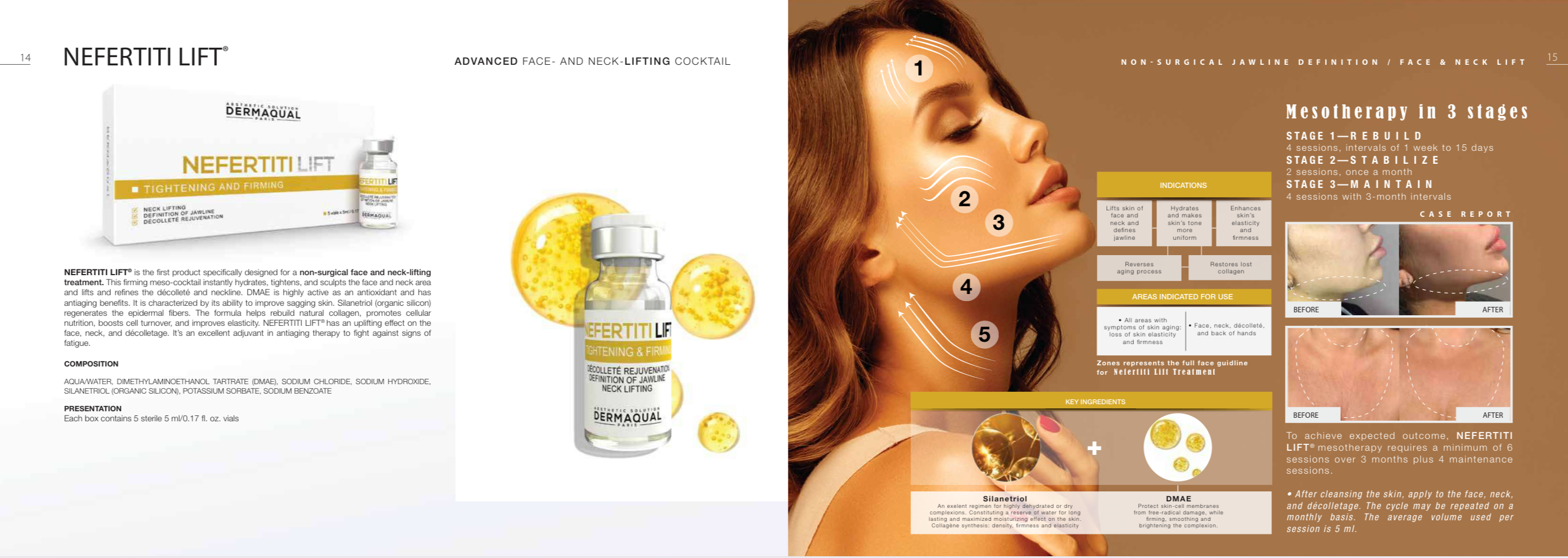 NEFERTITI LIFT is the first product specifically designed for a non-surgical face and neck-lifting treatment. This firming meso-cocktail instantly hydrates, tightens, and sculpts the face and neck area and lifts and refines the décolleté and neckline. DMAE is highly active as an antioxidant and has antiaging benefits. It is characterized by its ability to improve sagging skin. Silanetriol (organic silicon) regenerates the epidermal fibers. The formula helps rebuild natural collagen, promotes cellular nutrition, boosts cell turnover, and improves elasticity. NEFERTITI LIFT has an uplifting effect on the face, neck, and décolletage. It’s an excellent adjuvant in antiaging therapy to fight against signs of fatigue.